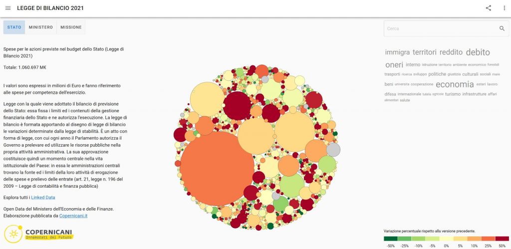 Budget.g0v.it è una innovativa applicazione per visualizzare in modalità interattiva la Legge di Bilancio dello stato Italiano. L’iniziativa, promossa dall’Associazione Copernicani e parte del progetto g0v.it, ricalca un progetto realizzato dalla comunità on-line g0v.tw che, a partire dal 2012, promuove a Taiwan una politica più orizzontale, e collabora con la Ministra per il Digitale Audrey Tang, nota attivista per la partecipazione digitale che ha partecipato alla presentazione del nostro Libro Bianco sulla partecipazione digitale.